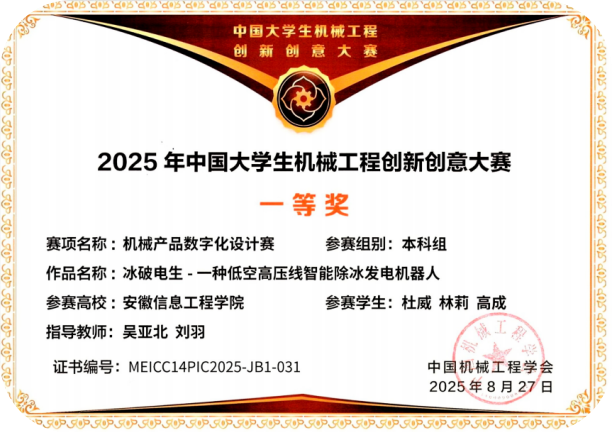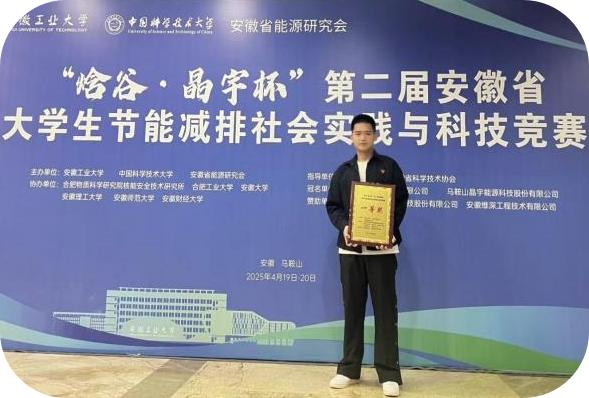 在学科竞赛中,他屡获佳绩。其项目“波能净滩”在节能减排竞赛中备受认可,“冰破电生——低空高压线智能除冰发电机器人”更在2025年中国大学生机械工程创新创意大赛中荣获国家级一等奖。他将个人理想融入国家创新战略,以实际行动践行科创报国初心。