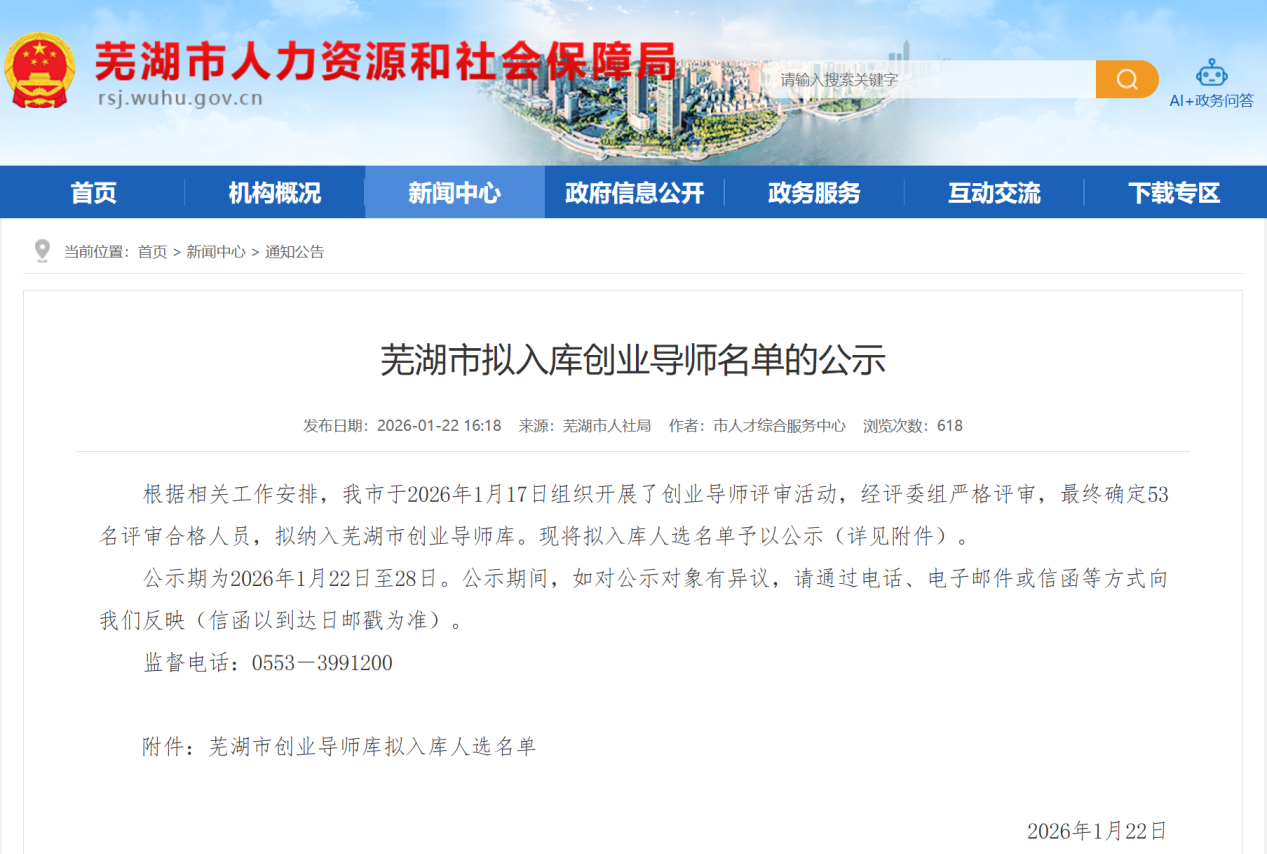 本网讯 近日,芜湖市人力资源和社会保障局发布《芜湖市拟入库创业导师名单的公示》,经过层层遴选、专家评审及公示等环节,全市最终确定53名人选,我校4名教师成功入选。此次入选不仅是对我校教师专业能力的高度认可,更是学校长期深化双创教育改革、强化师资队伍建设、赋能地方发展的重要成果。(图为我校入库人选名单)一直以来,我校坚持开放办学理念,积极构建全方位、多层次的双创教育生态,主动对接芜湖市区域发展需求,深度融入地方创新创业体系。学校通过与市人力资源和社会保障局及各类双创服务机构紧密联动、深化合作,打破校园围墙壁垒,实现校地资源互补、优势叠加,为双创教育落地见效搭建了坚实平台。此次我校4名教师成功入选,正是校地深度融合、协同育人的生动体现,标志着双方在人才共享与平台共建上迈出坚实一步。师资队伍是双创教育的核心支撑,我校始终将双创师资建设摆在重要位置,致力于打造“专兼结合、校地互通”的高水平团队。此次4名教师入选芜湖市创业导师库,将进一步丰富学校双创导师库结构,充分发挥入选导师的“头雁效应”,带动
